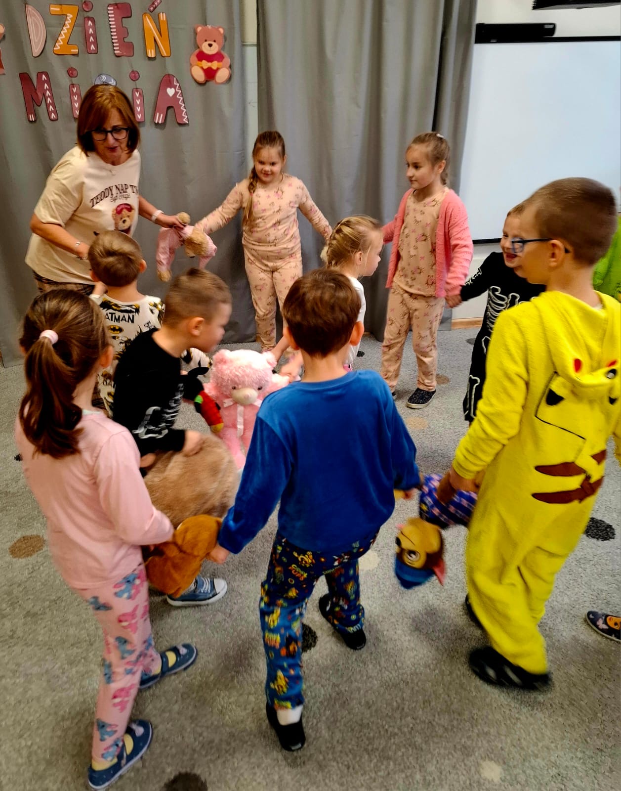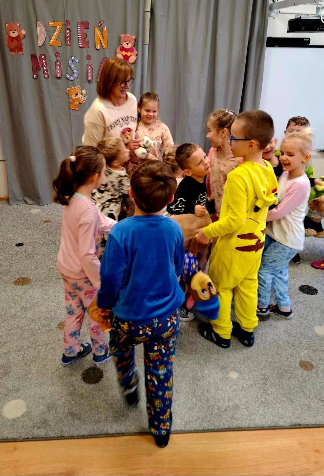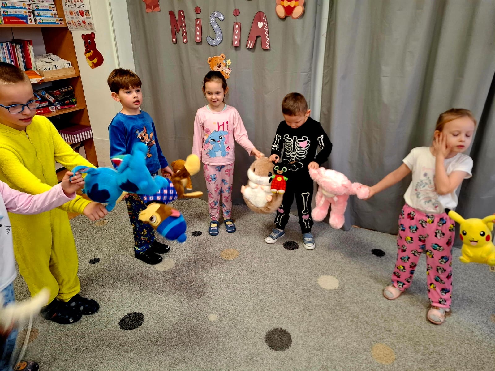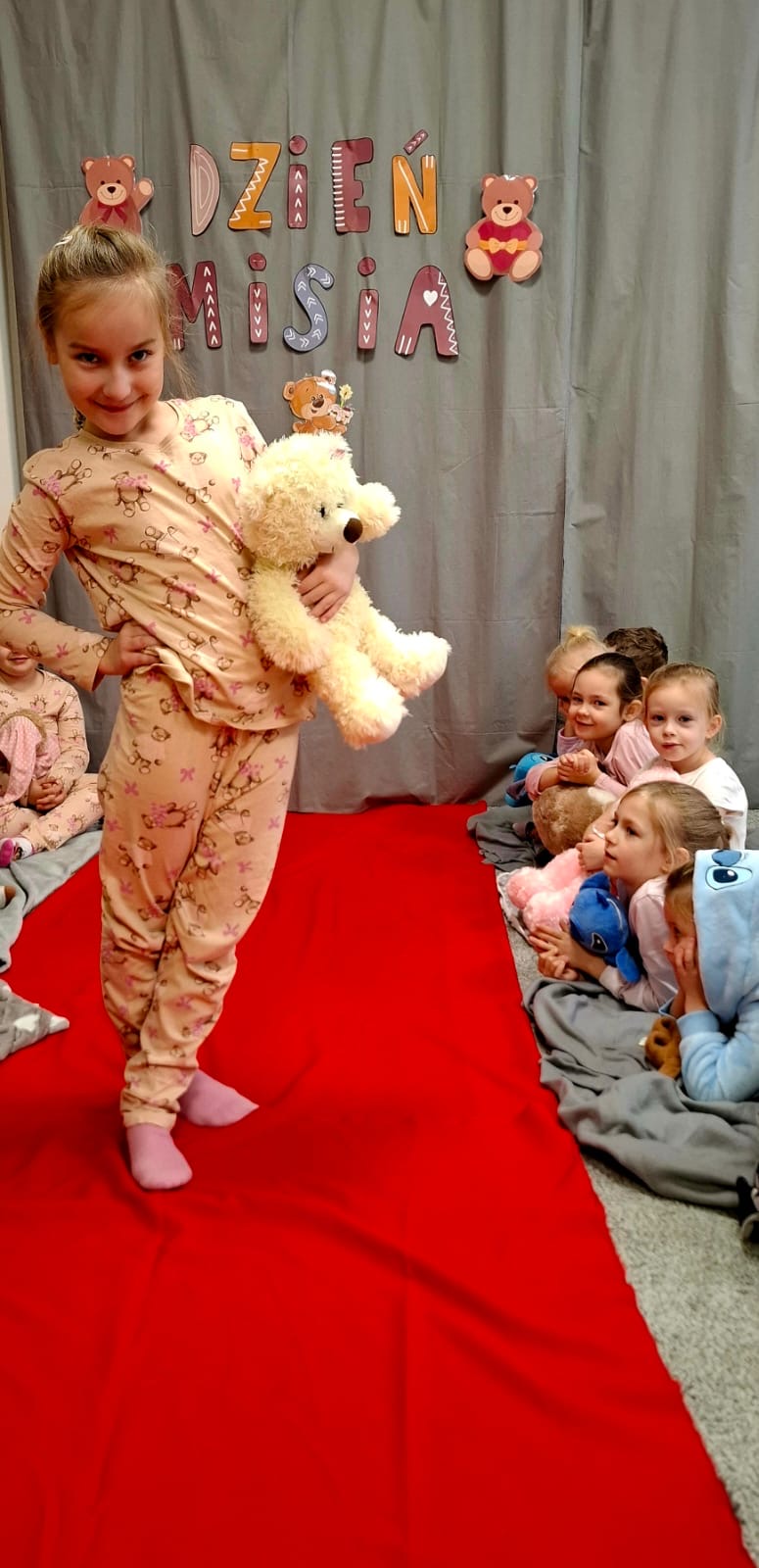 Dzisiaj obchodziliśmy wyjątkowy ,,DZIEŃ MISIA” pod hasłem ,,PIŻAMA PARTY”. Tego dnia wszystkie dzieci ( i nie tylko ;) przyszły ubrane w swoje ulubione piżamki, a wraz z nimi pojawiły się pluszowe misie i miękkie kocyki. Przedszkolaki w swoich grupach uczestniczyły w zabawach wiekowych, słuchały misiowych opowieści, brały udział we wspólnych tańcach. Było dużo śmiechu, przytulania i radosnej atmosfery. Takie chwile budują piękne wspomnienia i wzmacniają przedszkolną społeczność.