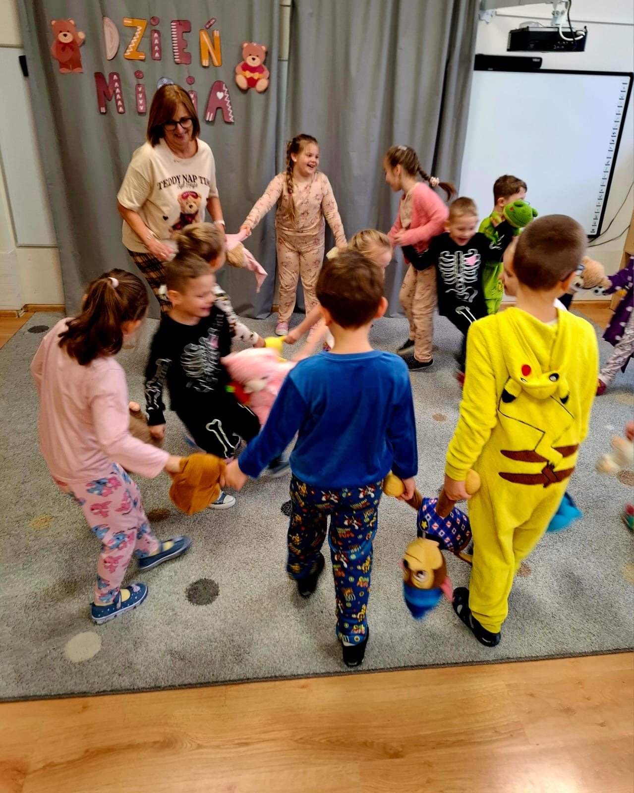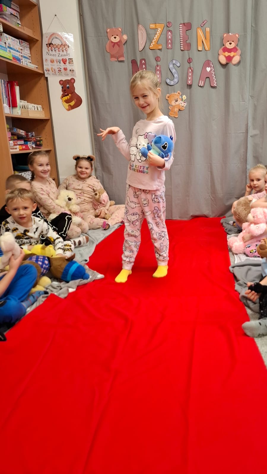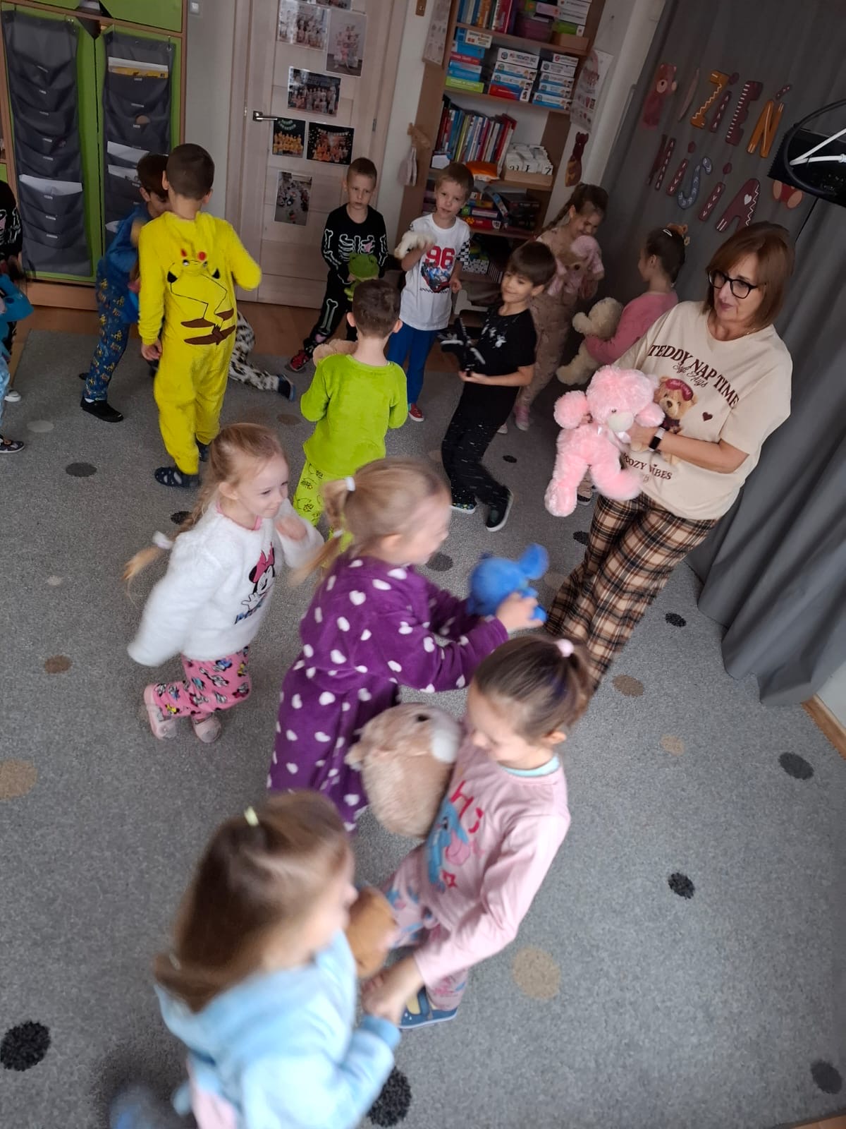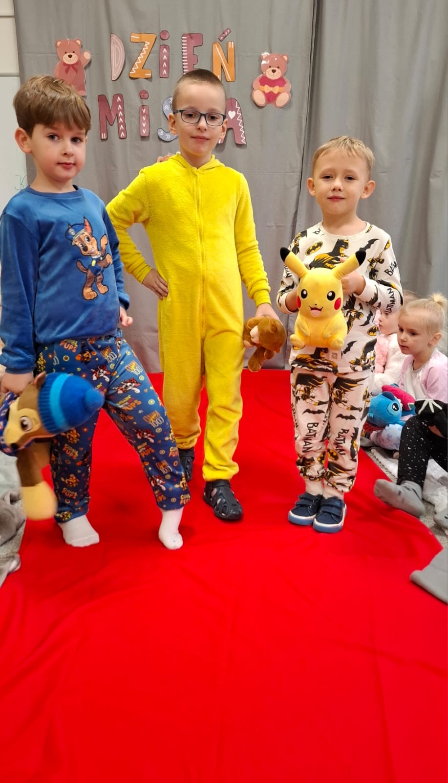 Dzisiaj obchodziliśmy wyjątkowy ,,DZIEŃ MISIA” pod hasłem ,,PIŻAMA PARTY”. Tego dnia wszystkie dzieci ( i nie tylko ;) przyszły ubrane w swoje ulubione piżamki, a wraz z nimi pojawiły się pluszowe misie i miękkie kocyki. Przedszkolaki w swoich grupach uczestniczyły w zabawach wiekowych, słuchały misiowych opowieści, brały udział we wspólnych tańcach. Było dużo śmiechu, przytulania i radosnej atmosfery. Takie chwile budują piękne wspomnienia i wzmacniają przedszkolną społeczność.