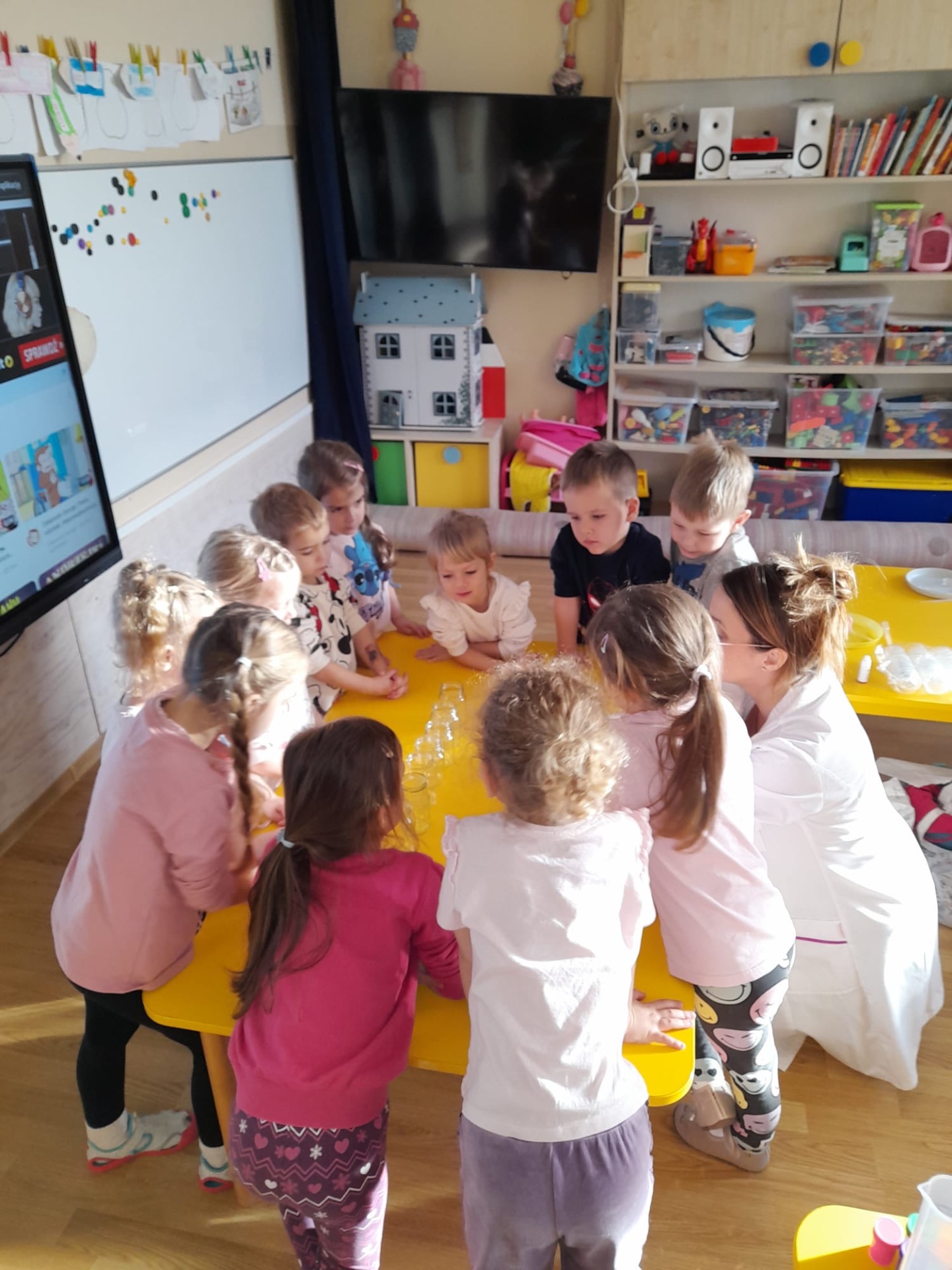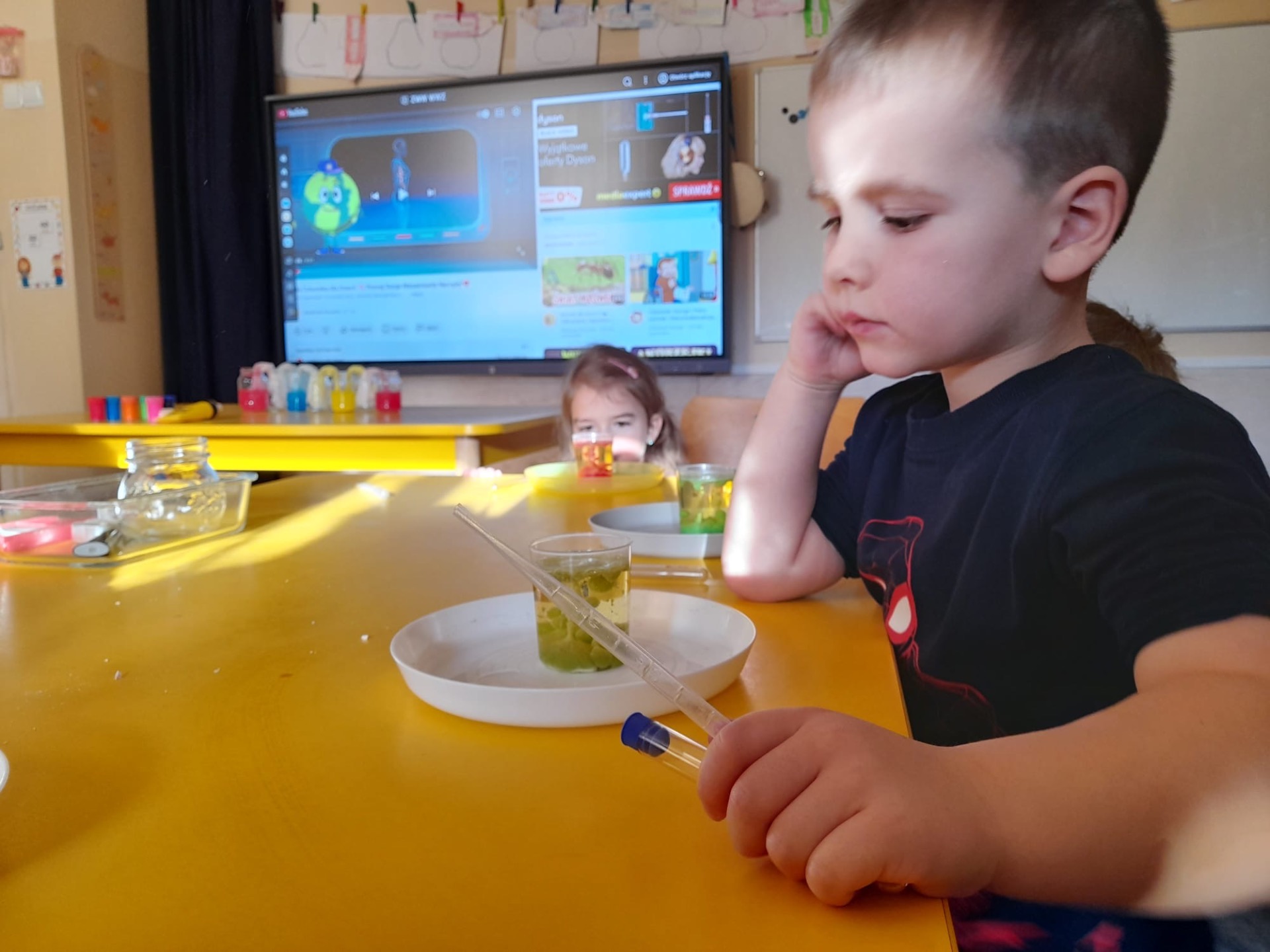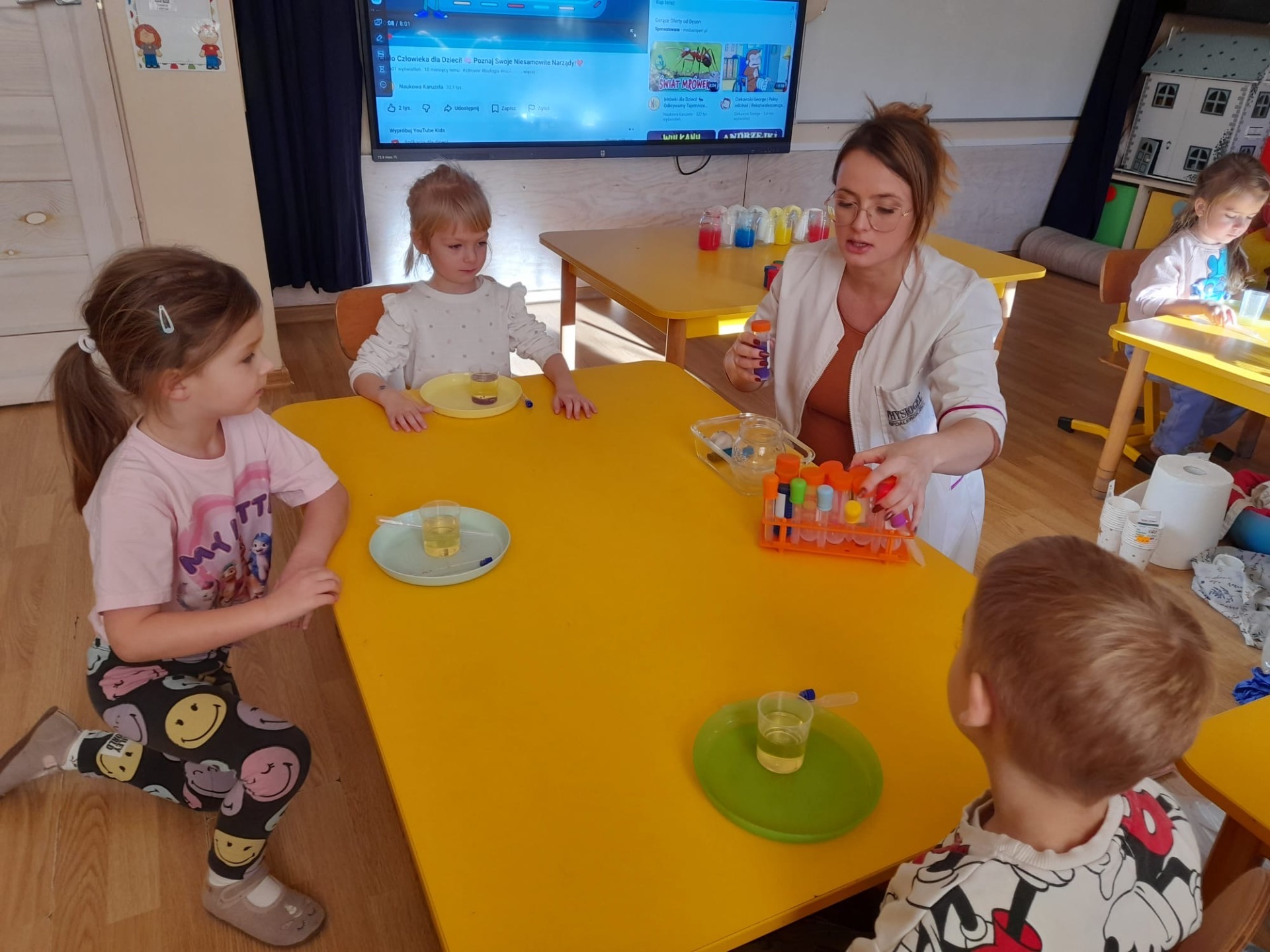 W czwartek 27 listopada odwiedziła grupę 4 latków mamusia Seweryna. Pani Karolina z zamiłowania jest chemikiem i przygotowała dla nas kilka ciekawych doświadczeń z wodą. Wszystkie dzieci z wielkim entuzjazmem podejmowały się nowych wyzwań i czerpały z nich wiele radości. Bardzo dziękujemy Pani Karolinie za odwiedziny i ciekawą naukę poprzez zabawę i doświadczenia. Bardzo zachęcamy innych Rodziców do spędzania z nami wolnego czasu.